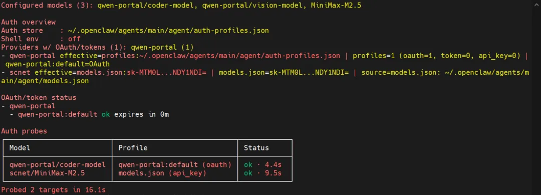 终端显示 scnet/MiniMax-M2.5状态为✅ online提示「探针测试成功」,无报错信息 可正常看到模型上下文窗口、最大 Token 信息