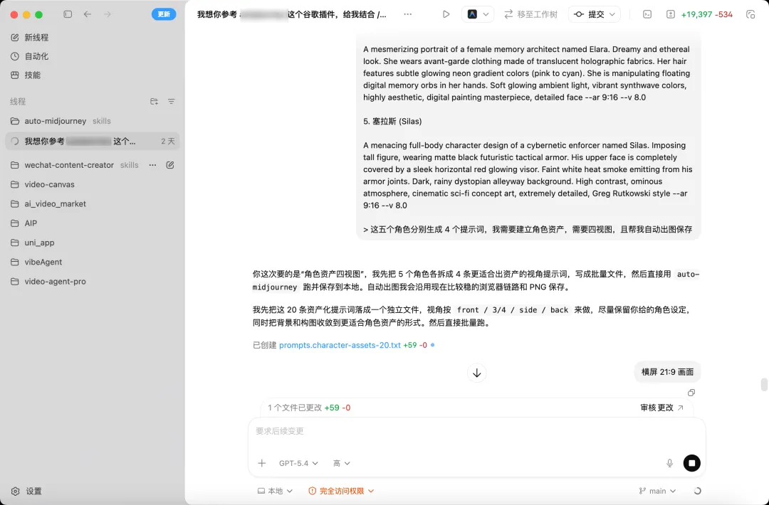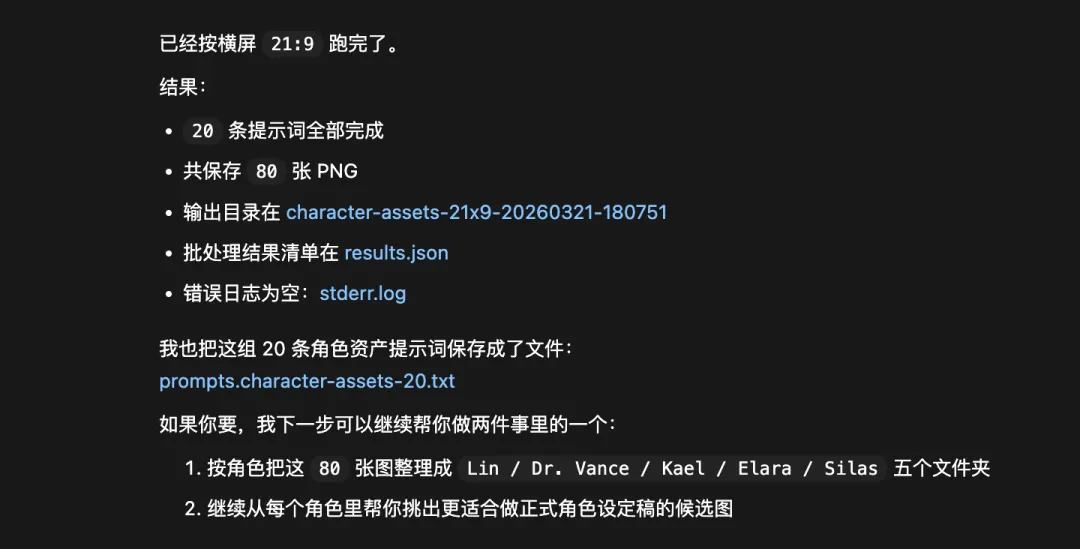 批量跑角色资产图,批量试封面海报图,批量试大场景和世界观图,把常用提示词沉淀成模板,再让 Agent 按你的要求继续往下跑。