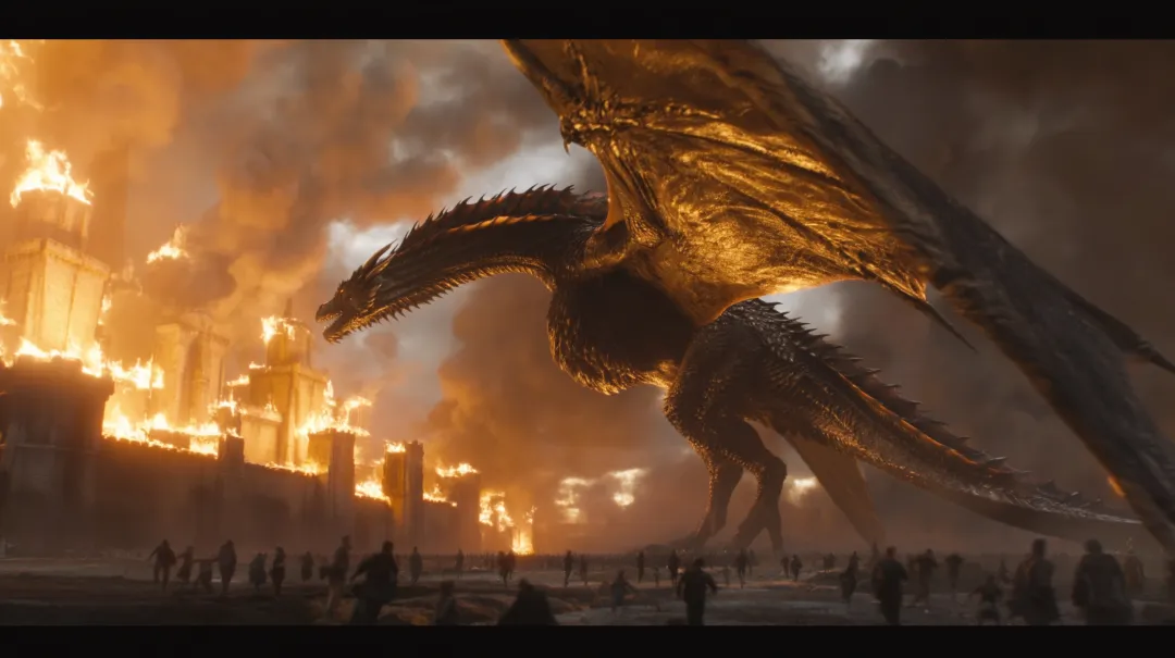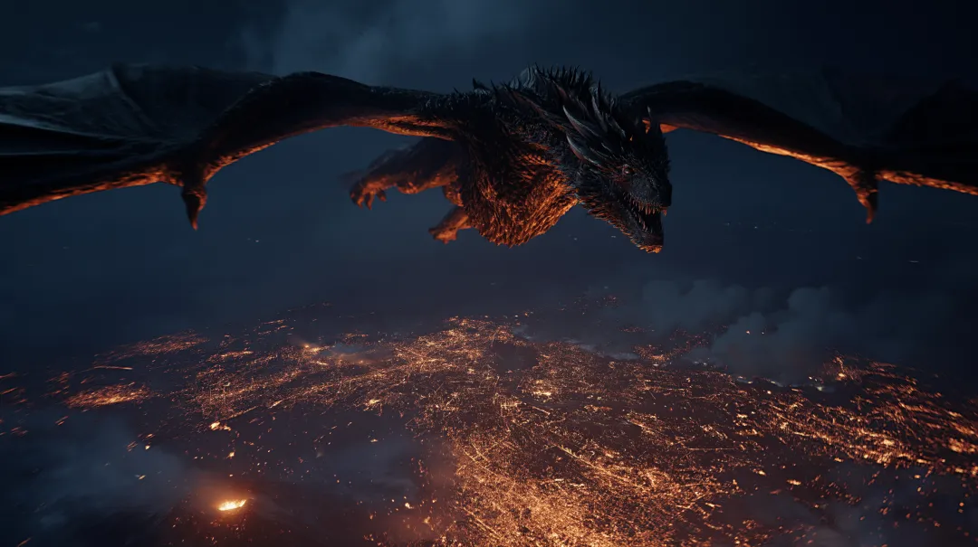 可以直接写成,巨龙盘旋在火山上方,超广角镜头,下方是小型城市作为尺度对比,熔岩发光,天空阴暗,电影感光影,宏大场景。