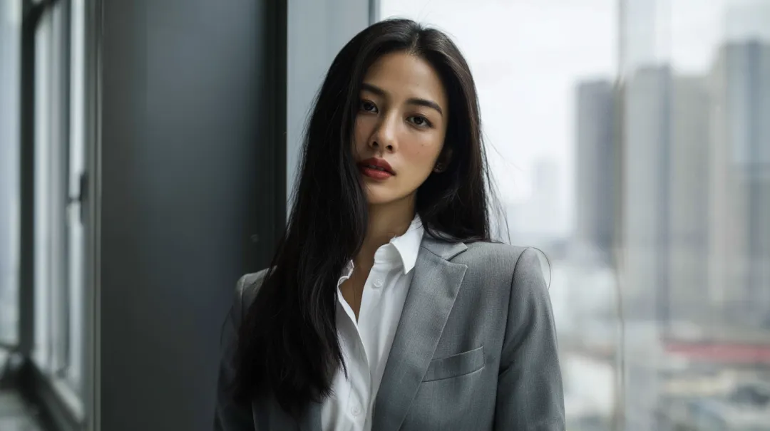 25岁都市女性,黑色长发,白衬衫,灰色西装外套,站在现代办公室落地窗前,神情克制,半身镜头,电影级写实摄影。