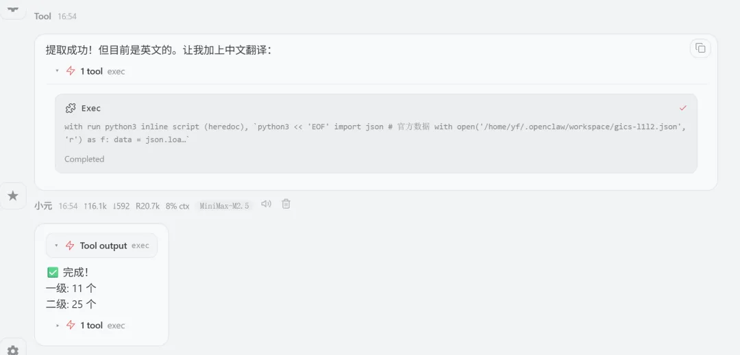 OpenClaw自己写了 Python代码 读取 Excel,提取一级和二级行业,并翻译成中文: