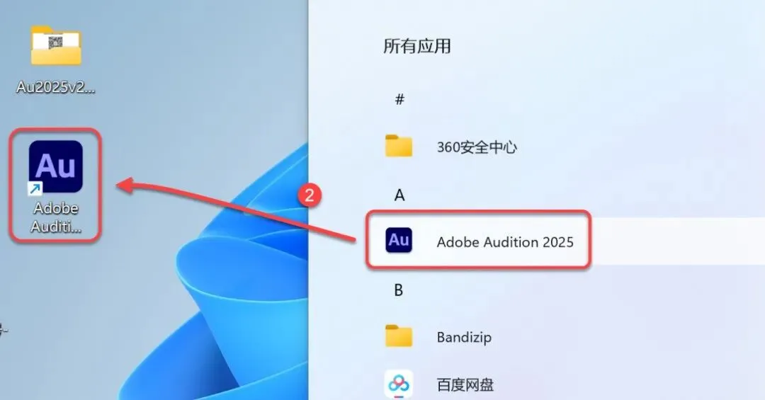 8.创建桌面快捷方式:①点击桌面任务栏中的【开始图标】>点击【所有应用】②将【Adobe Audition 2025】图标拖到电脑桌面。