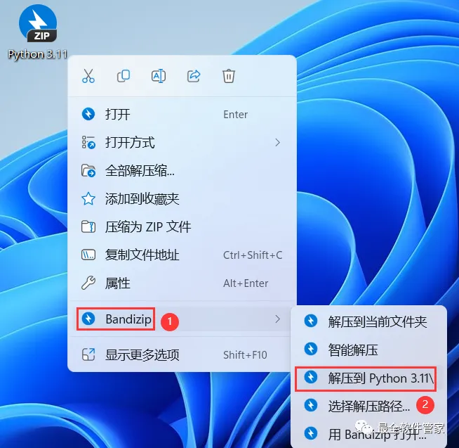 1、下载Python 3.11软件安装包到电脑上,右键选择【解压到Python 3.11\】