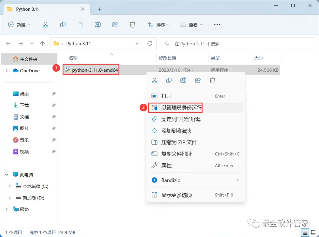 3、找到【python-3.11.0】应用程序,右键选择【以管理员身份运行】它