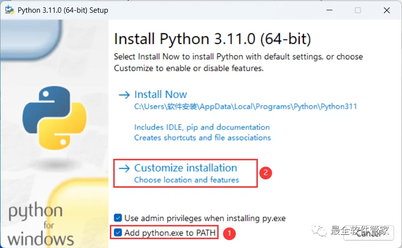 4、勾选【Add python.exe to PATH】,再点击【Customize installation】