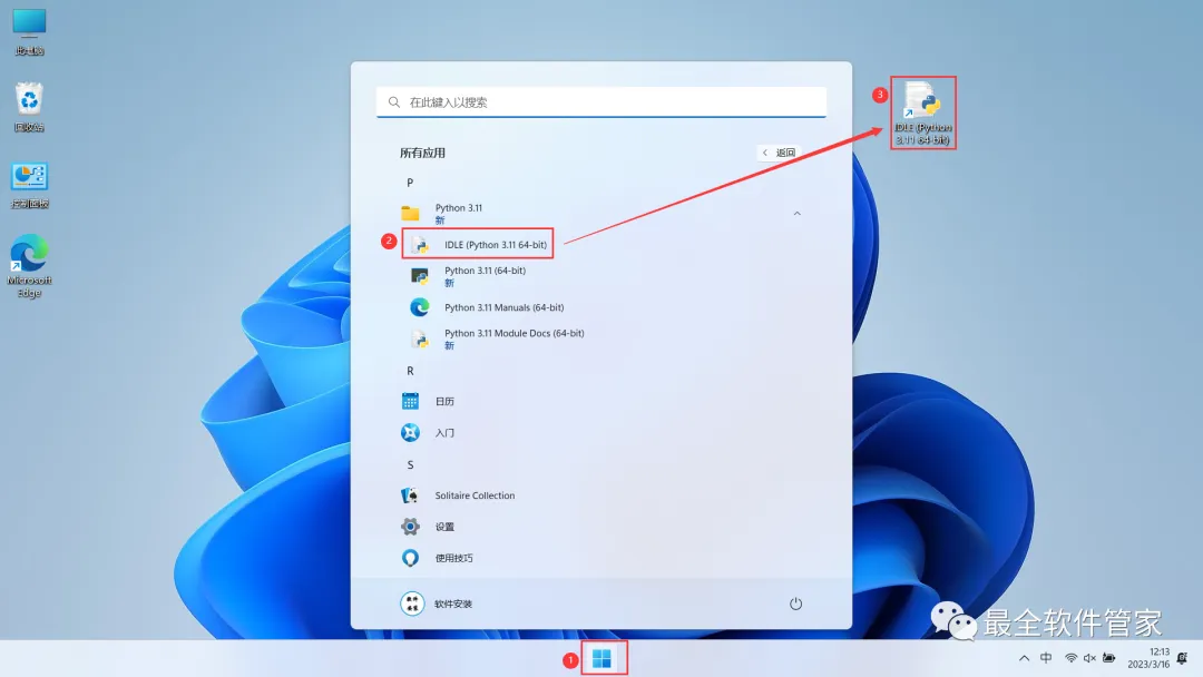 9、回到桌面,点击任务栏的【开始菜单】,在【所有应用】中找到【IDLE(Python 3.11 64-bit)软件图标】,将软件图标拖到桌面上,完成软件桌面快捷方式的创建
