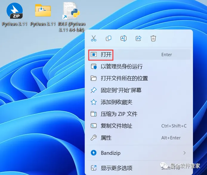 10、右键桌面上的【IDLE(Python 3.11)软件图标】,点击【打开】