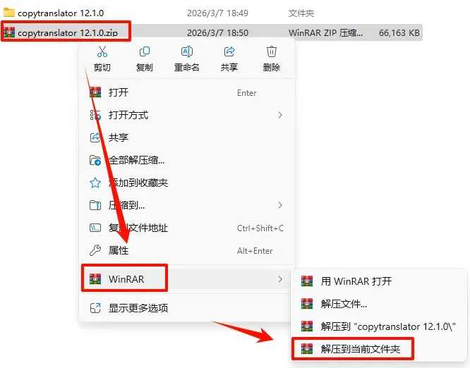 1.选中下载的压缩包,然后鼠标右键选择“解压到当前文件夹”(没有解压选项点这里)