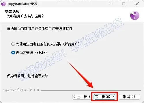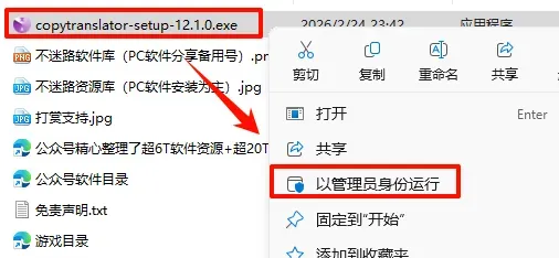 2.打开刚刚解压的文件夹,鼠标右键点击“copytranslator-setup-12.1.0.exe”选择“以管理员身份运行”