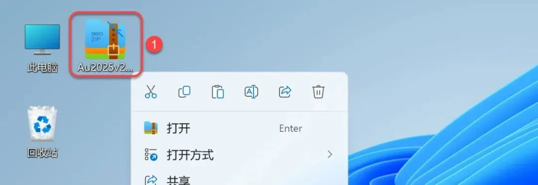 1.解压安装包:①鼠标右击【Au2025v25.0(64bit)】压缩包②选择电脑上安装的解压软件(如:360压缩)③点击【解压到Au2025v25.0(64bit)】。