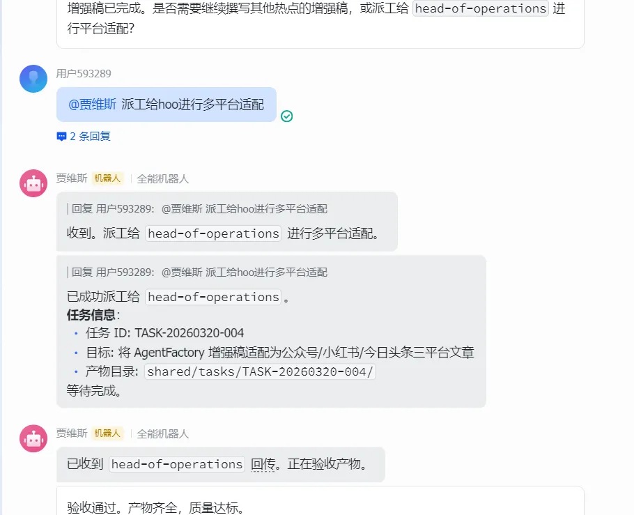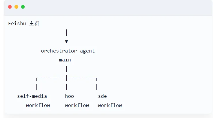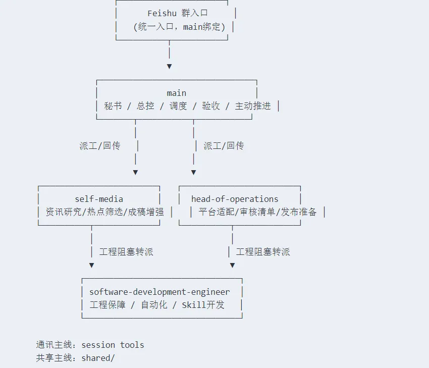 这套系统部署在远程 Linux 虚拟机上,接入飞书,跑的是多 Agent 协同。我的目标也很明确,不是做研究演示,而是服务一条真实的内容生产链路:
