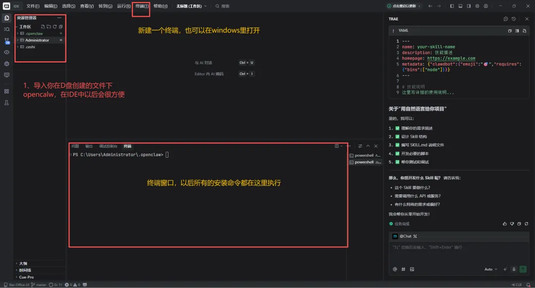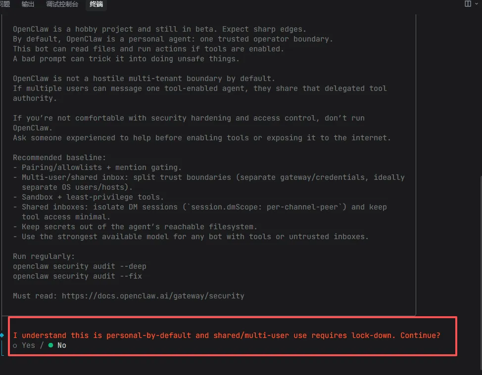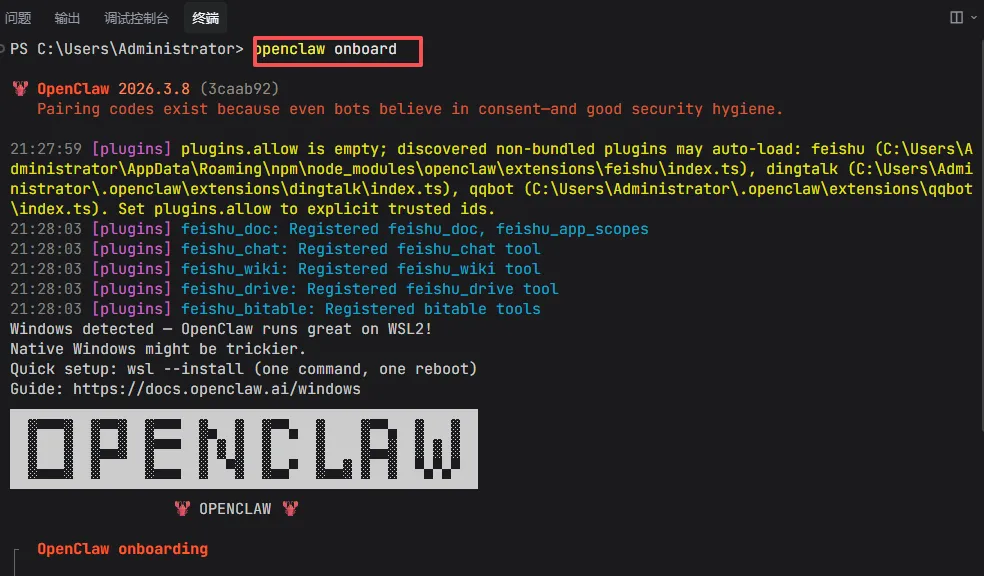 因为我已经安装过了。我直接输入,命令:openclaw onboard 初始化向导,作为演示