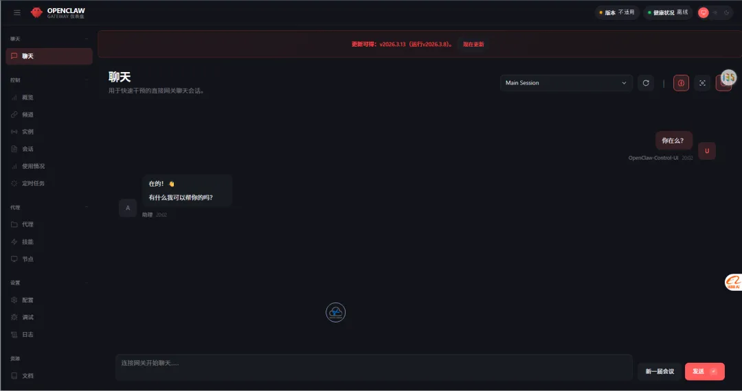 里面的内容会随着你装的插件越多,网关显示的内容也就越多,你看到我蓝色字显示的是“飞书”机器人已经部署,刚开始你们没有,不用着急,进入下一步。