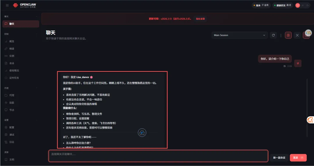 你采用的方式是本地的部署+链接KImi模型API的方式,你可以跟他在这里聊天对话。发一句测试一下