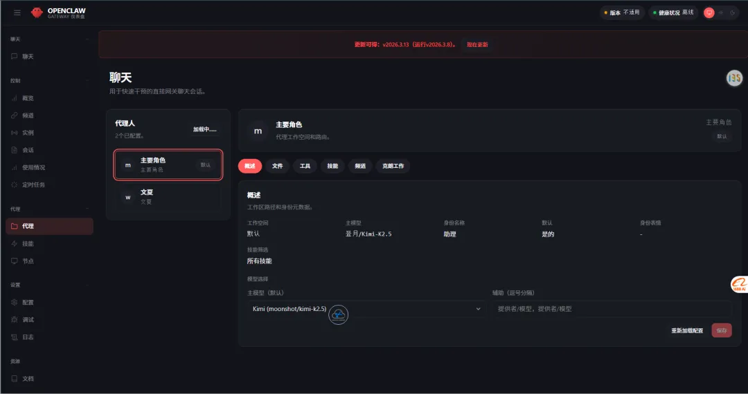 到此为止,你的基础虾塘已经落地了,剩下的时间你可以链接机器人,把想要必备的机器人部署上,像我这样,我本地有2个虾,一个“main”负责全局,一个"文案虾",也就是2个Agent。以后会协作自动化处理事务。