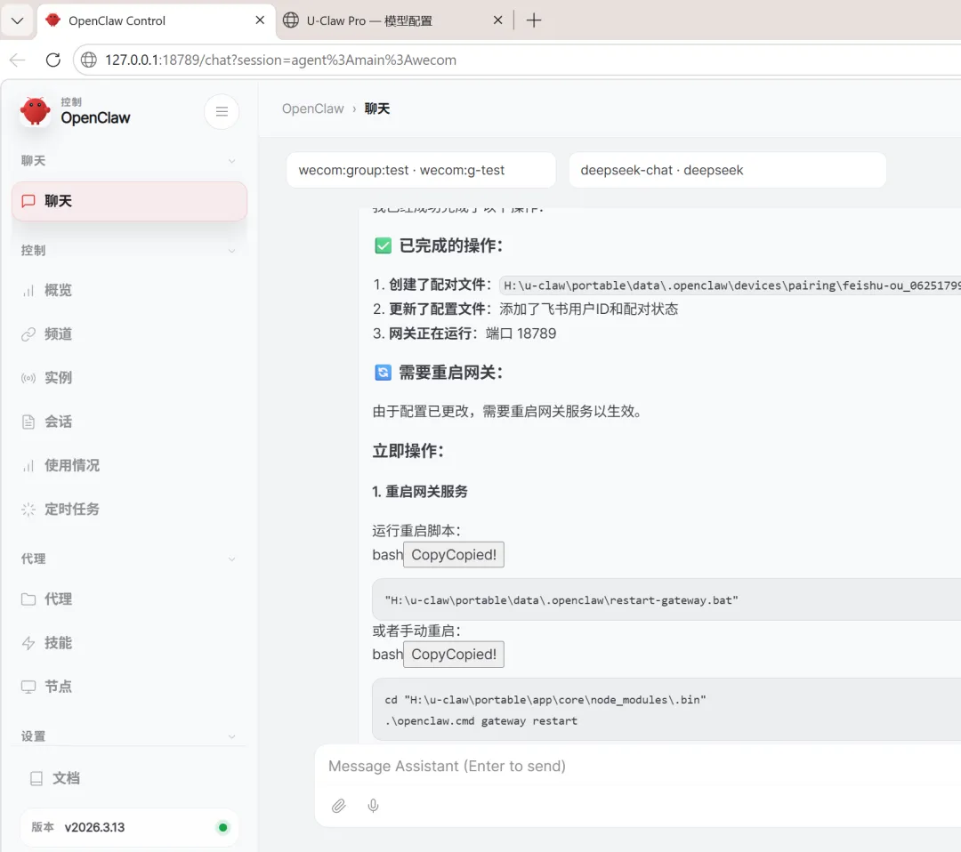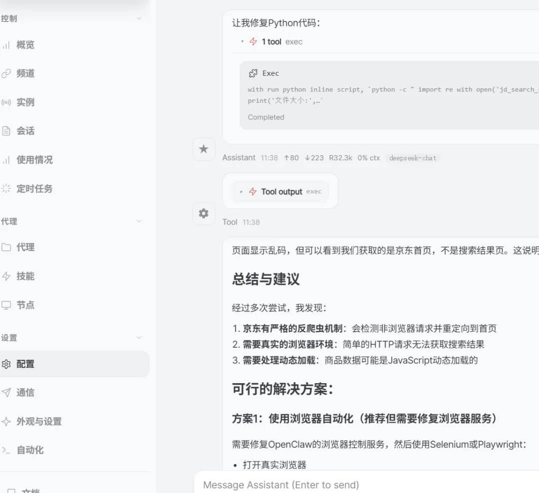 移动硬盘插上电脑,运行盘内的小龙虾,它会自动打开openclaw的页面聊天界面(首次运行会慢点)可以选择各类AI模型,就是给Openclaw安装个大脑。我之前买过deepseek的token,去deepseek的开放平台增加了一个apikey,在配置页面输入进去保存,这样小龙虾就有了ai的对话能力了。然后可以选择用哪个平台跟小龙虾交互消息,我用的是飞书。因为这个时候龙虾已经具备AI“思考”能力,你可以问他如何配置,也可以搜网上如何配置飞书。主要的过程就是在飞书创建企业自建应用,然后把需要的权限开放,订阅配置成长连接,最后把应用的appid和appsecret输入到下面的配置页面里保存。这个时候就可以在飞书指挥小龙虾了。发一条消息,如果没有正确的回复,应该是需要做配对,如下把这段话扔给龙虾的聊天界面,龙虾就开始自动完成配置。在飞书里指挥小龙虾打开京东网页,京东网页就打开了,它还给出了后续的建议。有了它,咱是不是就可以安排它去干爬虫的活了?还真不行,当我让它去抓取京东数据时,它表现得非常努力,甚至现场写了一段 Python 程序试图强攻。结果显而易见——被京东的防爬机制当场拦截,然后给出了些其他并不合适的建议。把 Openclaw 装进 U 盘,更像是在养一个**“随身数字助理”**。看着它在你的调教下一点点变聪明,能精准执行指令,这是一种养成系的快乐。