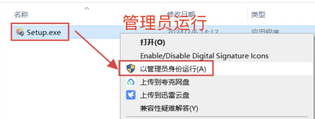 选中:Setup 程序,右键选择:以管理员身份运行。