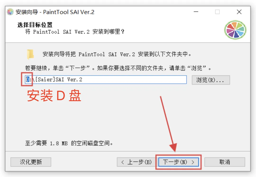 4、选择安装位置:可以将路径首字母C改为其他盘符(如D),表示安装到D盘,然后点击:下一步。