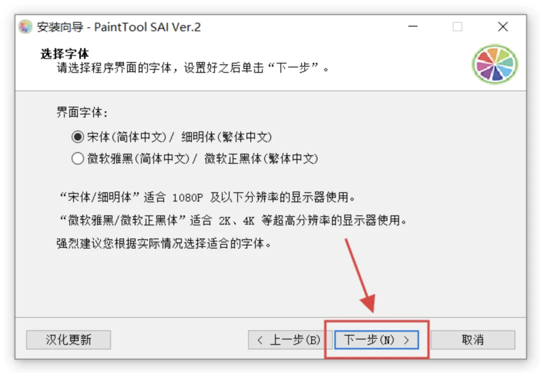 6、选择字体:根据您的显示器分辨率进行选择,1080P推荐:宋体,2K或4K以上推荐:微软雅黑,选择后点击:下一步。