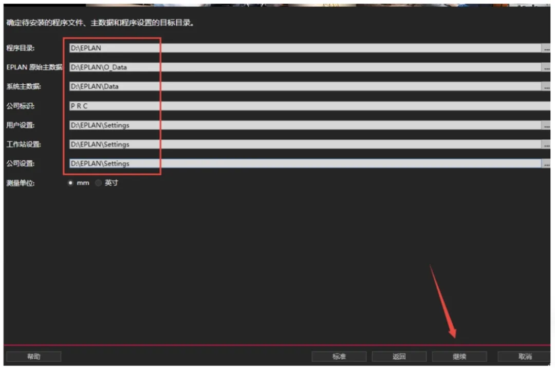 建议将安装路径修改为 D:\EPLAN(参考图示),不建议安装在系统盘,点击:继续。