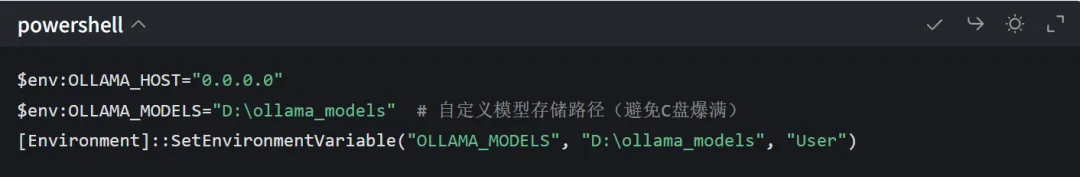 $env:OLLAMA_HOST="0.0.0.0"$env:OLLAMA_MODELS="D:\ollama_models" # 自定义模型存储路径(避免C盘爆满)[Environment]::SetEnvironmentVariable("OLLAMA_MODELS", "D:\ollama_models", "User")