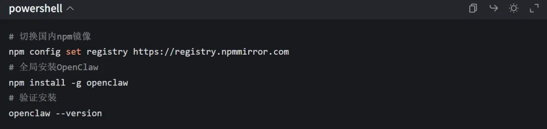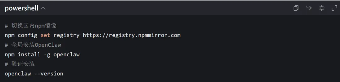 # 切换国内npm镜像npm config set registry https://registry.npmmirror.com# 全局安装OpenClawnpm install -g openclaw# 验证安装openclaw --version