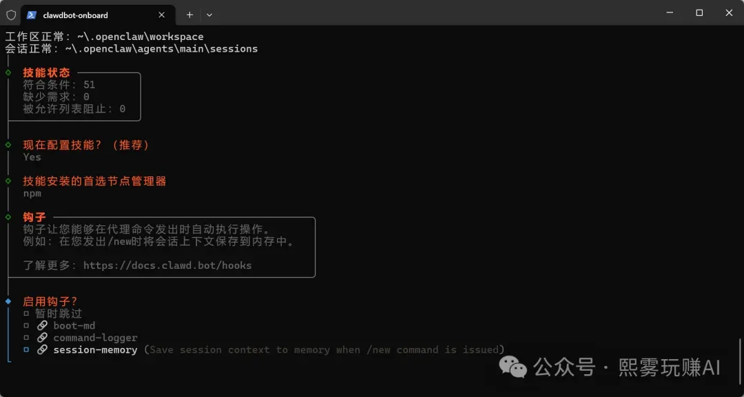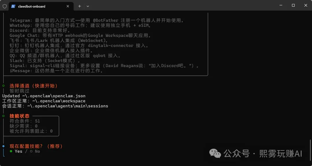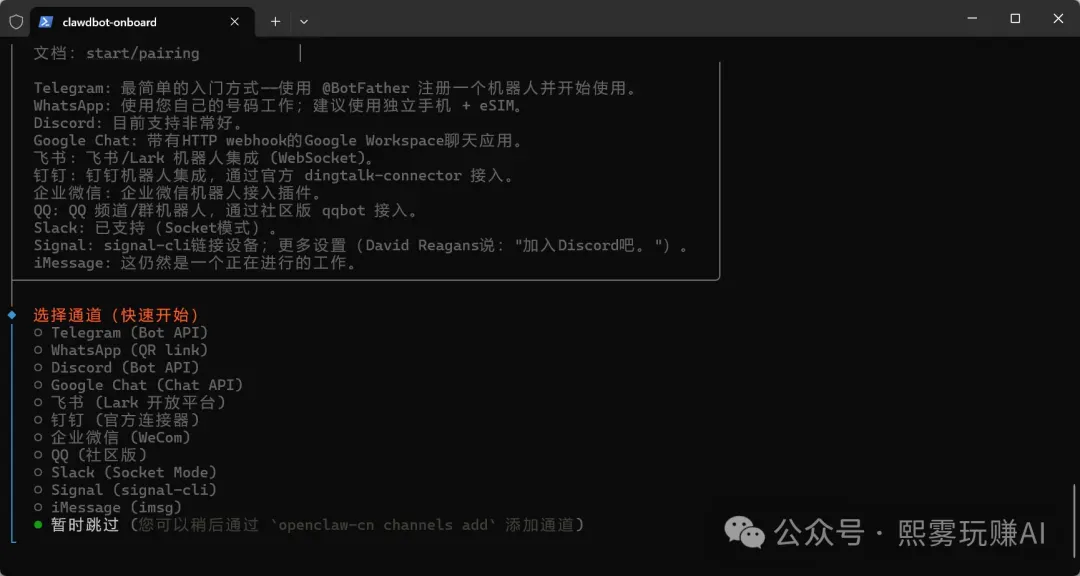 这一步是选择聊天通道,你现在只需要本地免费使用 OpenClaw 的网页版,不需要对接任何外部聊天平台,所以直接选择暂时跳过✅。
