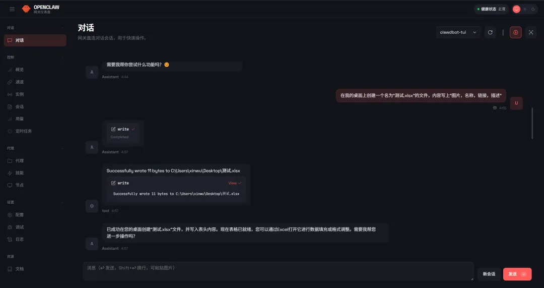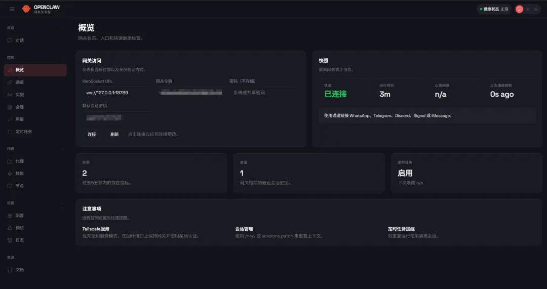 进入OpenClaw 概览,界面右上角显示「健康状态 正常」,说明服务已经正常运行,不需要额外注册本地账号,可以直接开始使用。