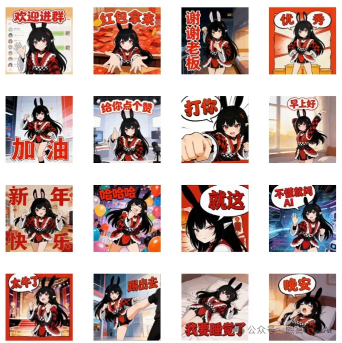 | 【红衣少女日常】-专辑16张动态表情包 点击公众号菜单栏【AI百宝箱】-【AI表情包】 |
