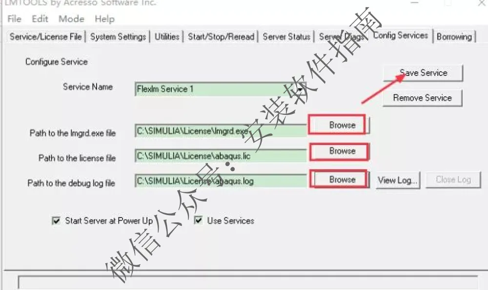 15 、在Config Services中点Browse,选择C:\SIMULIA\License\2016\win_b64\code\bin里的lmgrd.exe、abaqus.lic和abaqus.log三个文件,点Save Services