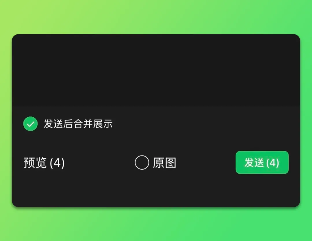 微信内测图片/视频折叠功能,给好友选取发送3张及以上的图片/视频时,在左下角会出现「发送后合并展示」的选项。