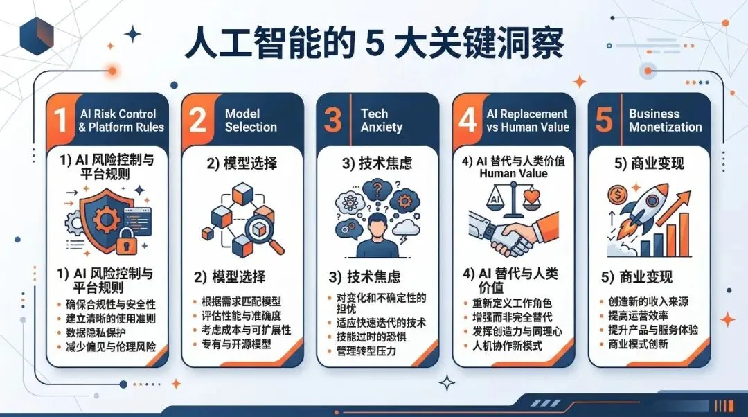 AI替代重复性工作,实现降本增效;但高端、需要人性判断、情感交互的工作无法替代。长期思考:AI会不会让人的基础能力退化?关键场景还是需要人能力兜底。判断5:商业变现的核心逻辑