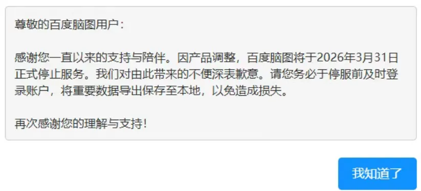即将停服,赶紧下载~~~百度脑图批量导出办法 非常方便的一款在线脑图平台,遗憾将于3月31日退场。相信很多朋友都有大量文件,一个个下载实在头大。好消息是XMIND给出了批量下载插件。接下来大家按步骤操作完成即可。点此链接下载浏览器插件:https://d.xmind.cn/ImDItCg#btn下载安装后,进入脑图网站,自动会在界面出现以下按钮。下载、安装可参考:https://xmind.cn/blog/tool-baidunaotu-dumper