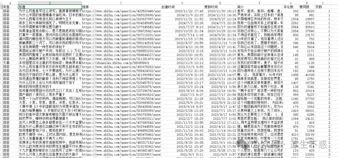 顺便导出了知乎收藏夹列表目录excel,数据包含类型,标题,链接,创建时间,更新时间,简介 ,评论数,赞同数和页数(超过500条数据第2次下载的时候输入的最大页数)。