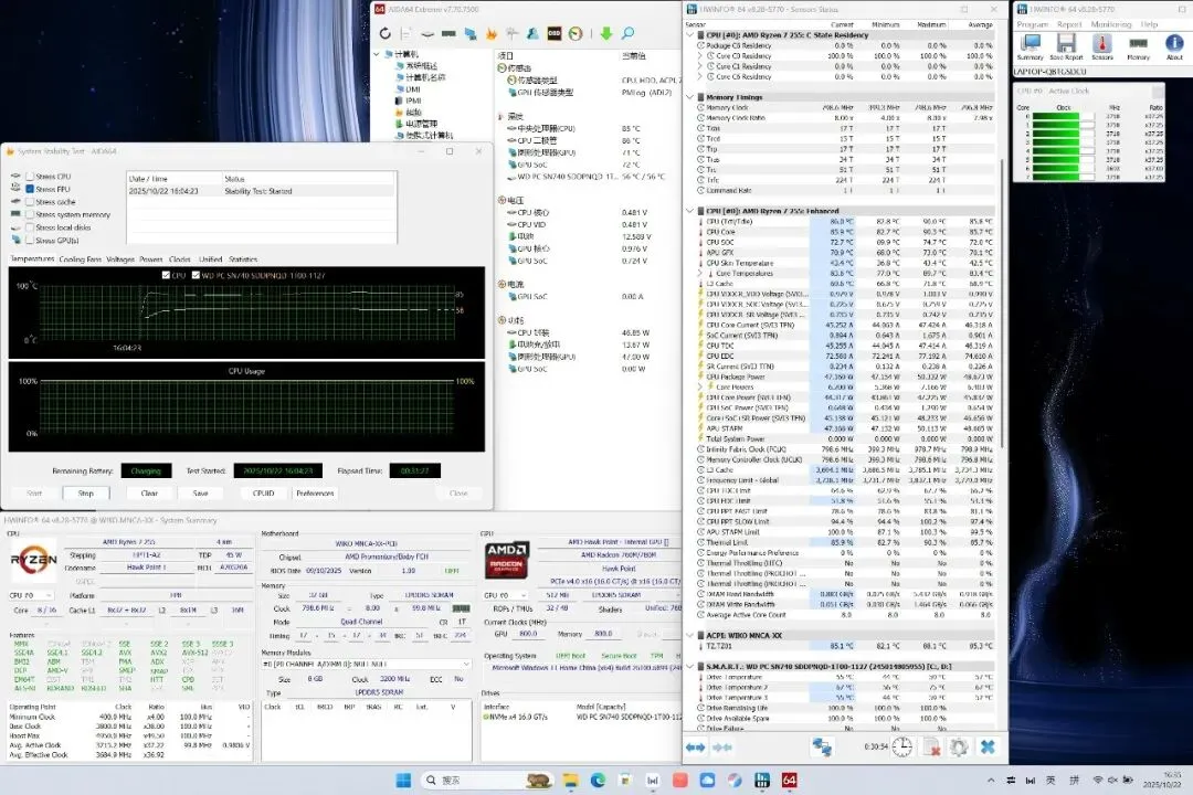 在满载状态下,开启高能模式,CPU温度稳定在86.0℃,功耗约47W,频率在3.7GHz左右。