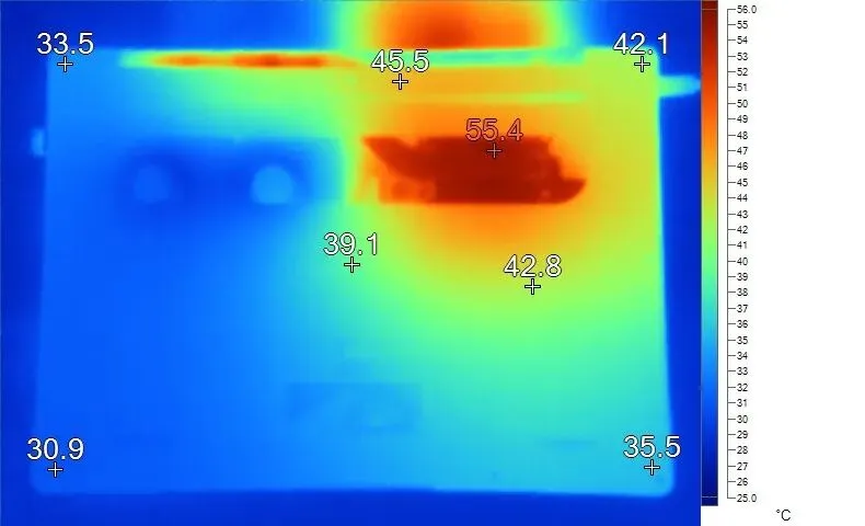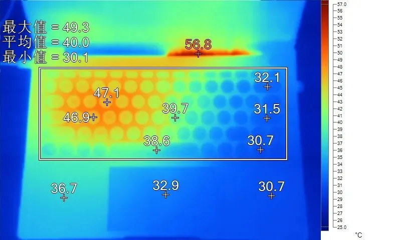 表面温度如上图所示,键盘键帽最高温度出现在“E”键上,为47.1℃,WASD键为46.9℃,方向键30.7℃。左腕托温度为36.7℃,背面中心点39.1℃。