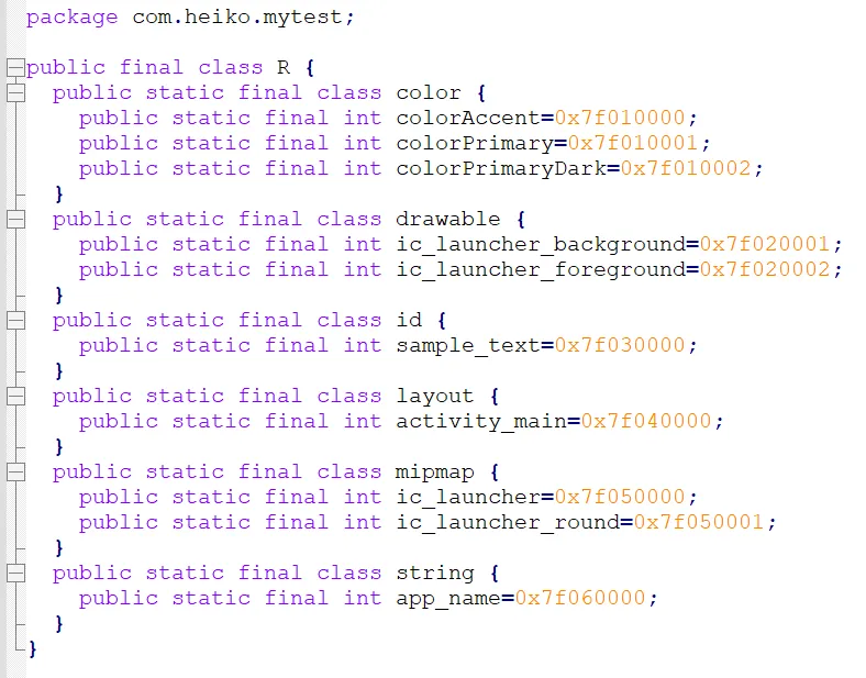 AndroidManifest.xmlcom└─heiko└─mytestMainActivity.javares├─drawable│ ic_launcher_background.xml├─drawable-v24│ ic_launcher_foreground.xml├─layout│ activity_main.xml├─mipmap-anydpi-v26│ ic_launcher.xml│ ic_launcher_round.xml├─mipmap-hdpi│ ic_launcher.png│ ic_launcher_round.png├─mipmap-mdpi│ ic_launcher.png│ ic_launcher_round.png├─mipmap-xhdpi│ ic_launcher.png│ ic_launcher_round.png├─mipmap-xxhdpi│ ic_launcher.png│ ic_launcher_round.png├─mipmap-xxxhdpi│ ic_launcher.png│ ic_launcher_round.png└─valuescolors.xmlstrings.xmlstyles.xml