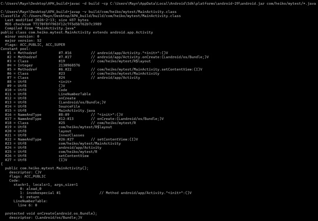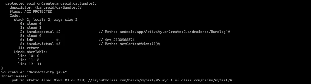 javap -v build/com/heiko/mytest/MainActivity.class