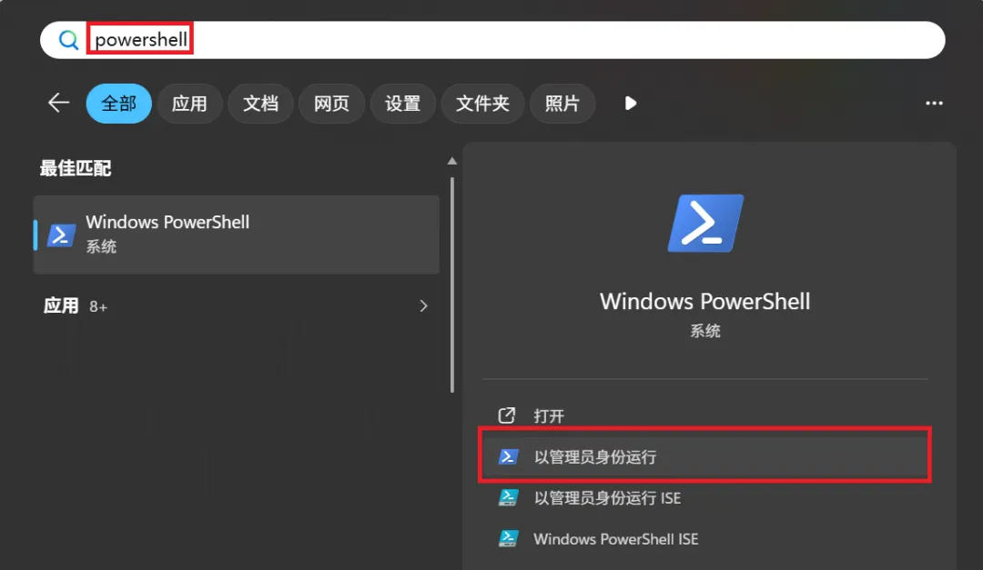 然后在弹出的窗口的搜索项中输入powershell,并在右边选择“以管理员身份运行”即可: