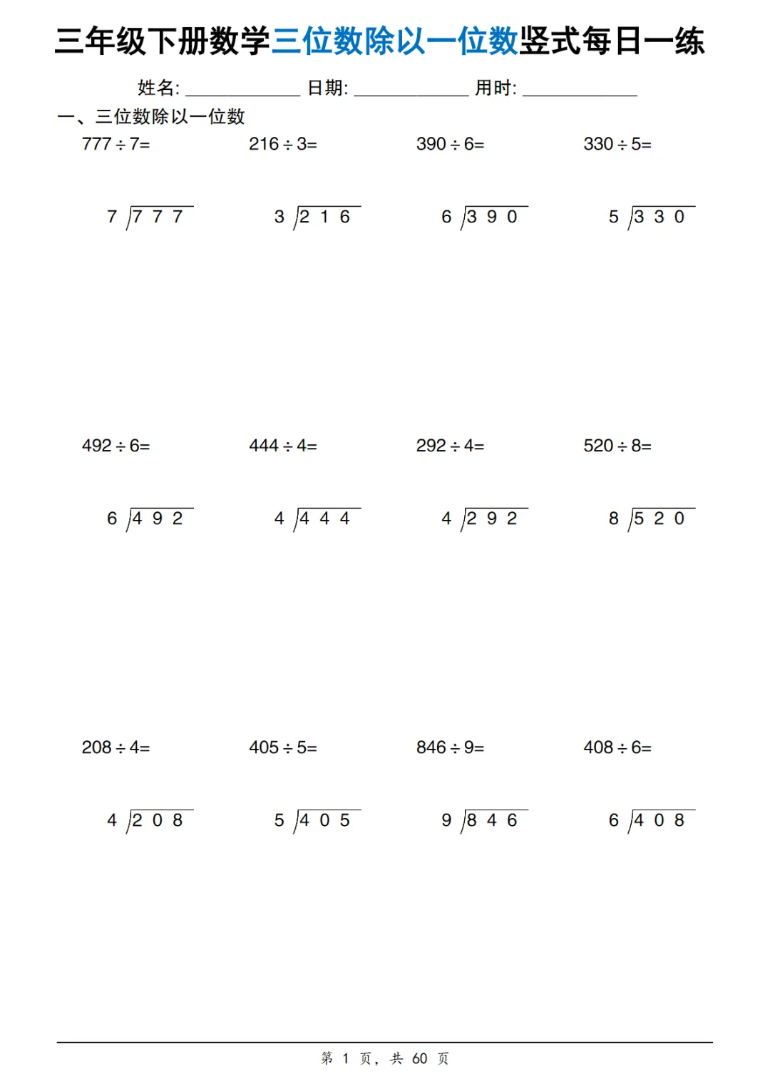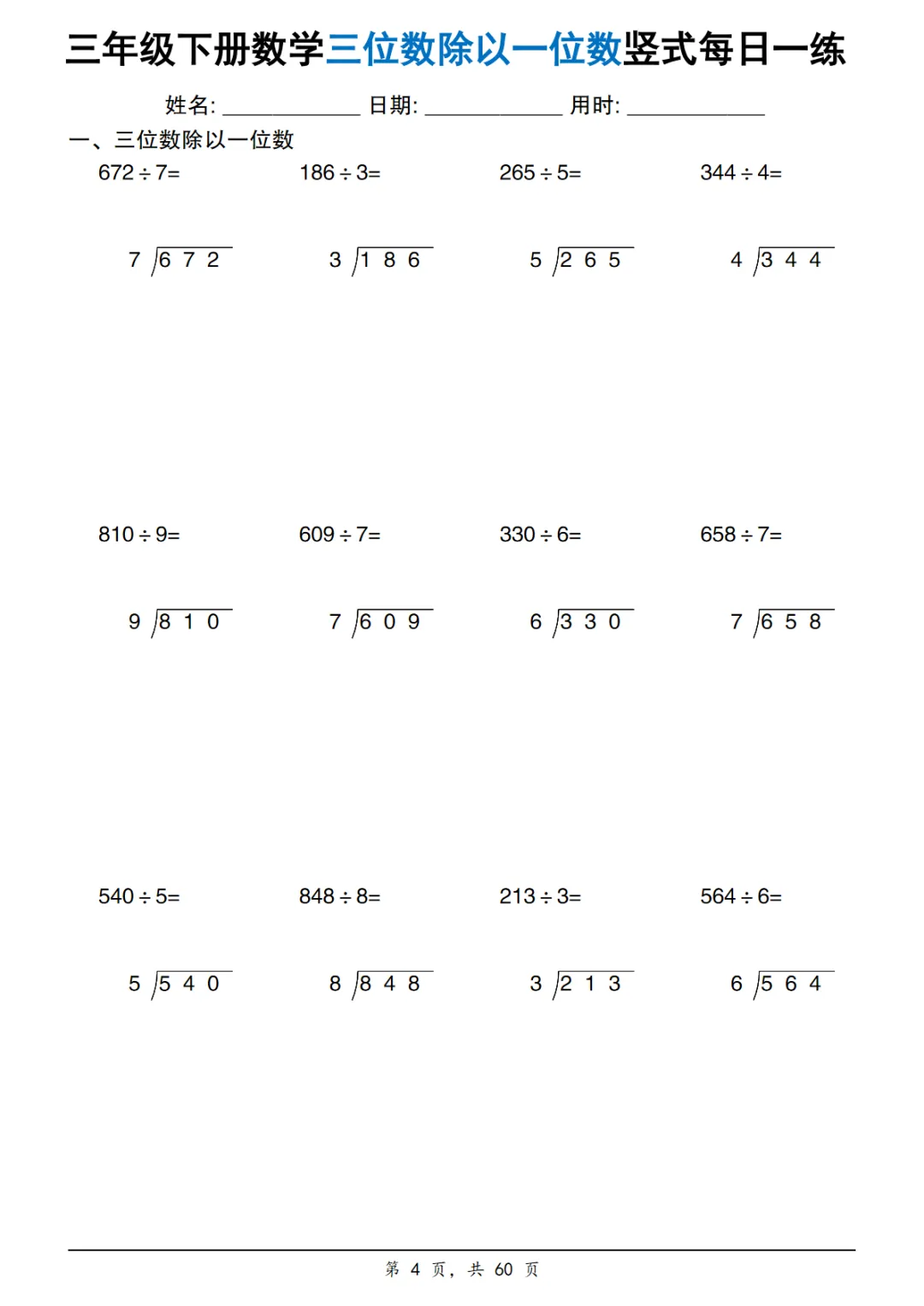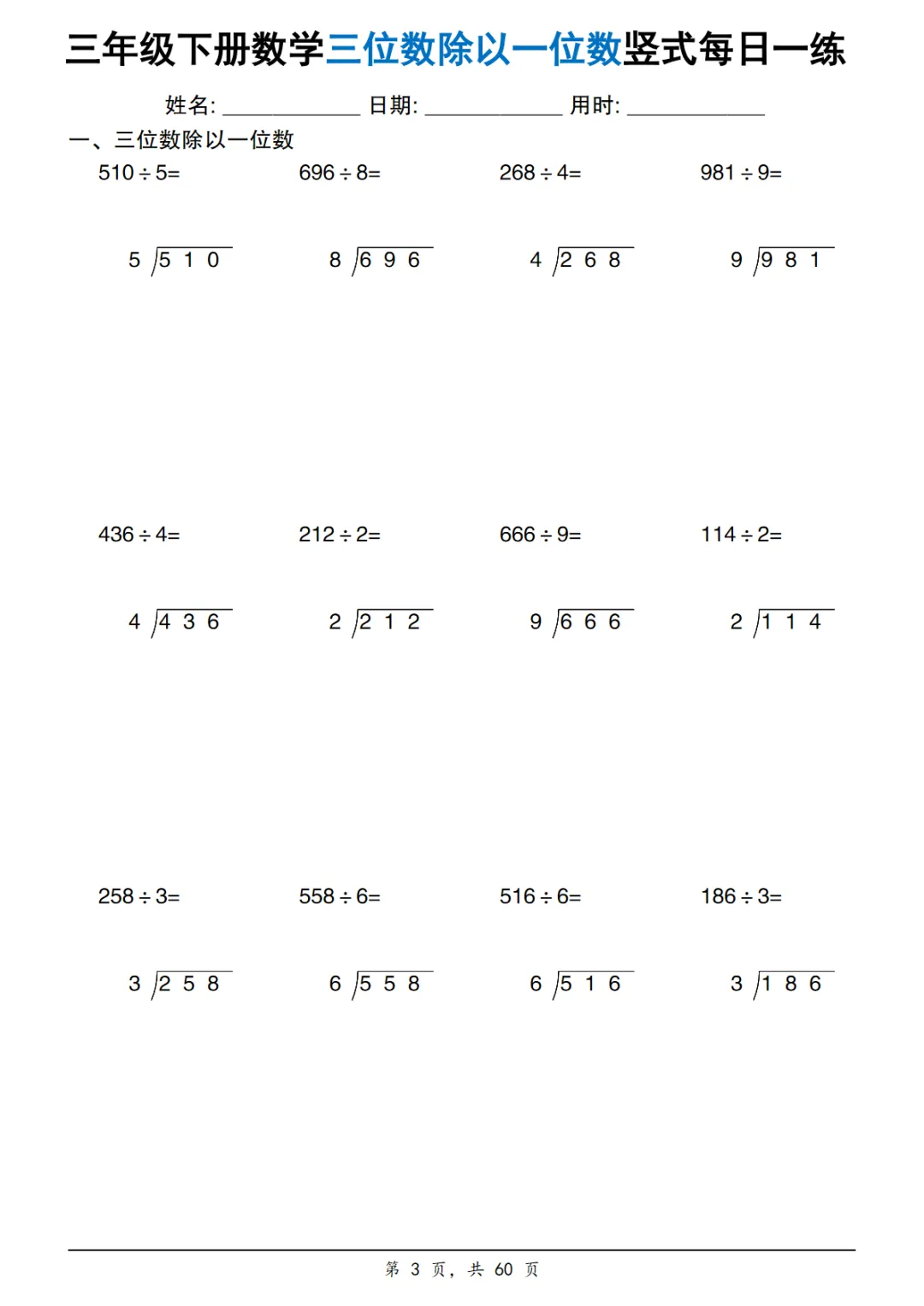 【免费下载】三年级(下)数学 三位数除以一位数竖式每日一练60套,PDF电子版,可打印点击上方蓝字关注更多优质资源资源介绍三年级(下)数学 三位数除以一位数竖式每日一练60套https://pan.baidu.com/s/1ajNmDRiYXky9owTcW25mtw?pwd=5555复制链接到浏览器打开,或者微信发给自己即可点开点击文末”阅读原文“,获取全套教辅资料资源太多,仅展示部分内容点击图片,查看大图▼▼▼▼版权声明:本资源为免费分享,仅供学习和教学使用版权归原作者所有,如有侵权请联系删除点击“阅读原文”下载完整PDF电子版