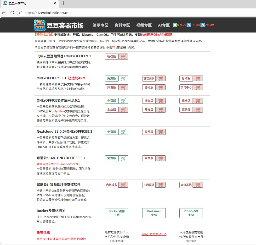 豆豆容器市场专注提供优质Docker应用服务,集成一键式容器安装功能,助力用户快速部署OnlyOffice、协作空间、Jitsi-Meet会议系统、内网域名系统、Nextcloud、可道云等办公应用。平台新增IPv6内网直连技术,搭配自动化SSL证书配置及智能域名解析功能,为家庭云服务提供完整技术方案,简化私有云搭建与运维流程,轻松实现高效云端协作管理。