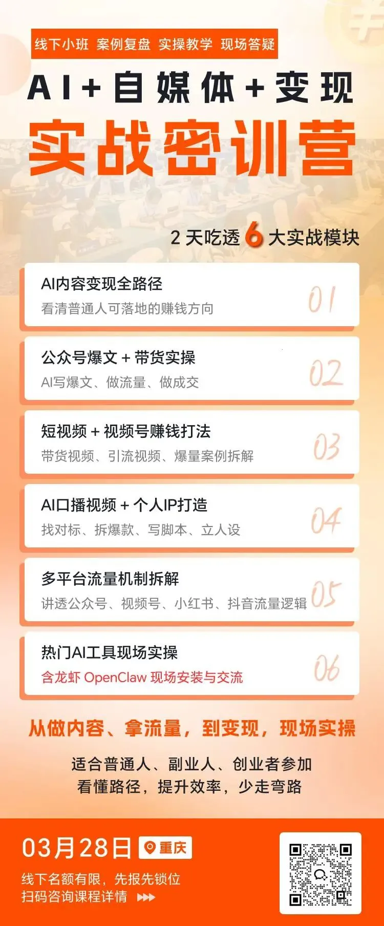 这也正是我们线下密训营所要解决的核心问题。在这两天的时间里,我不会去讲那些空泛的行业前景,而是只带着你开展手把手的实操工作。从关于龙虾 OpenClaw 的高级安装调试,到配合豆豆羊 AI 系统来实现如何快速批量地生产爆款,再到针对视频号以及多个平台的矩阵起号逻辑,全部都是一些掰开揉碎了的实战步骤。