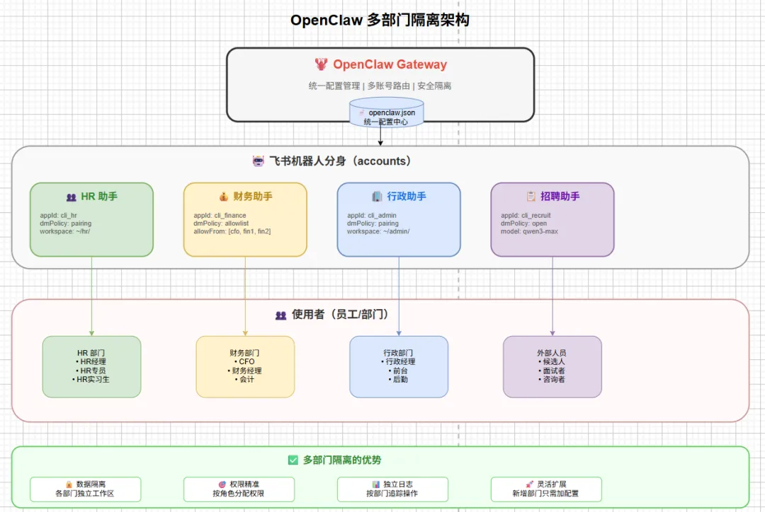 { "agents": { "defaults": { "workspace": "~/.openclaw/workspace", "model": { "primary": "gateway/qwen3.5-plus" } } }, "channels": { "feishu": { "enabled": true, "defaultAccount": "hr", // 默认用 HR 机器人 // 多账号配置 "accounts": { // HR 部门 "hr": { "appId": "cli_hr", "appSecret": "xxx", "botName": "HR 助手", "dmPolicy": "pairing" }, // 财务部门 "finance": { "appId": "cli_finance", "appSecret": "yyy", "botName": "财务助手", "dmPolicy": "allowlist", "allowFrom": ["ou_cfo", "ou_finance_1", "ou_finance_2"] }, // 行政部门 "admin": { "appId": "cli_admin", "appSecret": "zzz", "botName": "行政助手", "dmPolicy": "pairing" } } } }, "security": { "exec": { "defaultPolicy": "allowlist", "allowlist": ["git", "ls", "cat"] } }}适用场景: