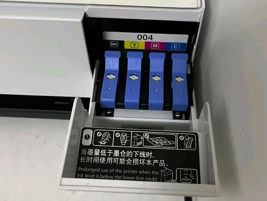 打印机首次使用就得冲墨,这是基本常识,当然这个是喷墨式打印机,而且爱普生也是做喷墨打印机非常牛的品牌了。这个首次充墨之前需要加墨水,把四瓶墨水分别加注到对应颜色容器中,切记,这个颜色不能加错了,看你什么颜色的墨水瓶,就加在哪个颜色的墨水仓里面,都有标注。