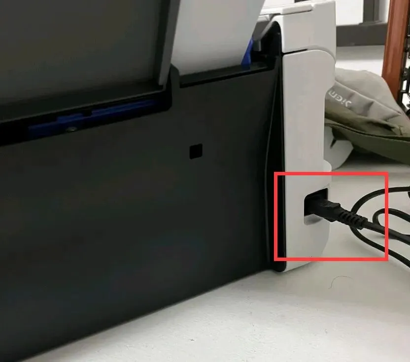当你加完墨水后,就要准备开机通电,然后进行第一次充墨了,在爱普生打印机后屁股这里有个电源接口,把爱普生电源插口接上电源就行了。这个时候按一下开关机按键,爱普生打印机就会发出声音了。