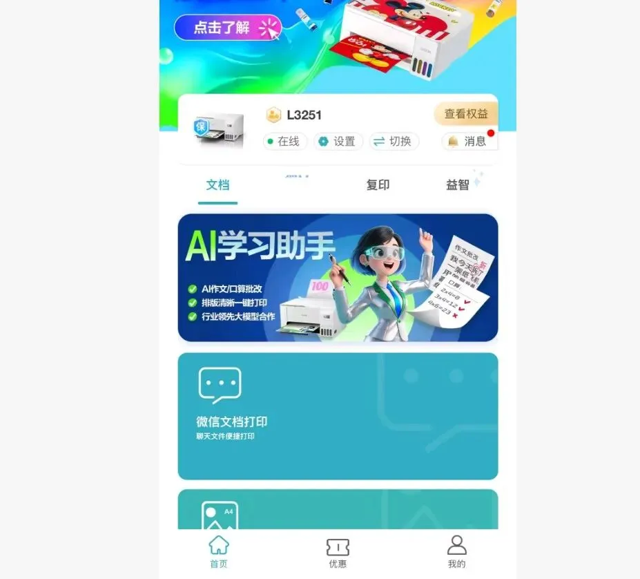 爱普生打印机只要连接到wifi,其实就很容易打印了,爱普生的Epson Smart Panel软件,还有爱普生旗下的叫做“爱普生云打印”这个小程序都可以用,里面都会有打印的功能按钮。