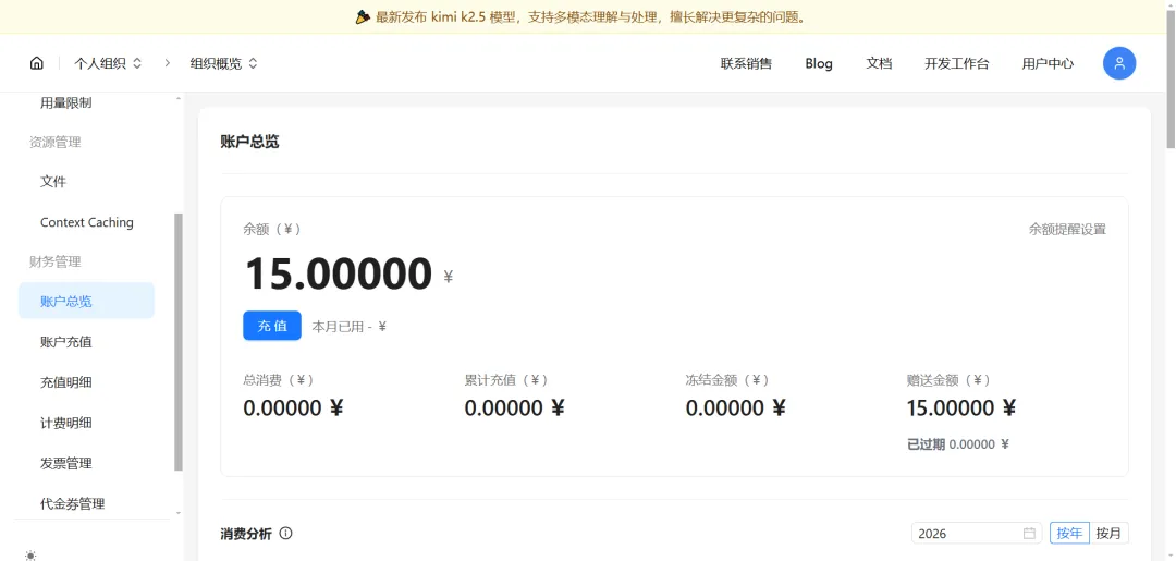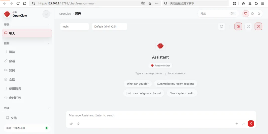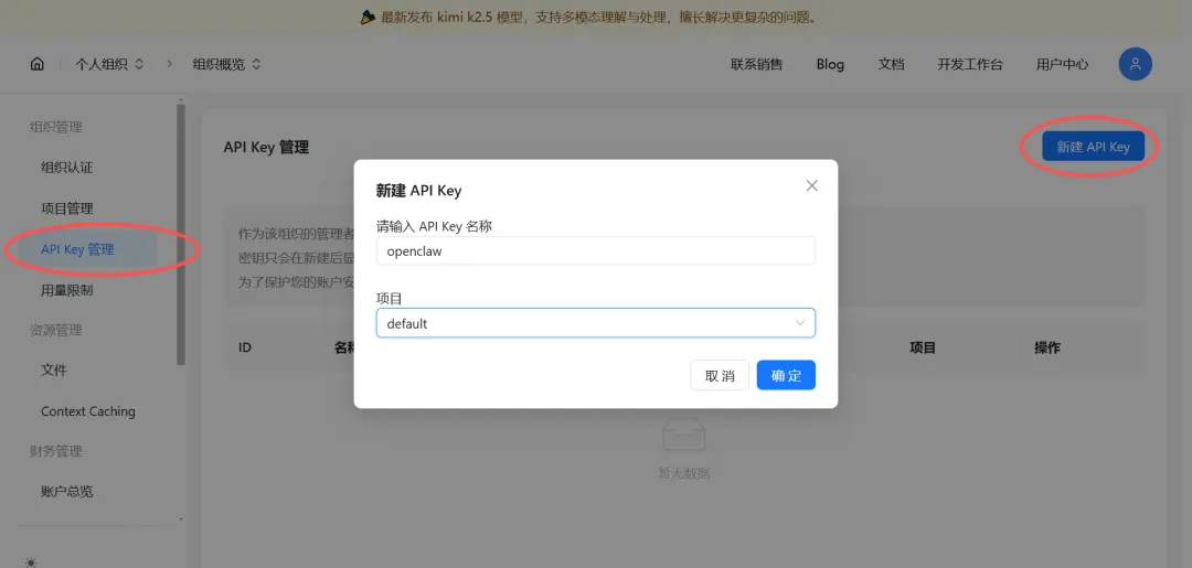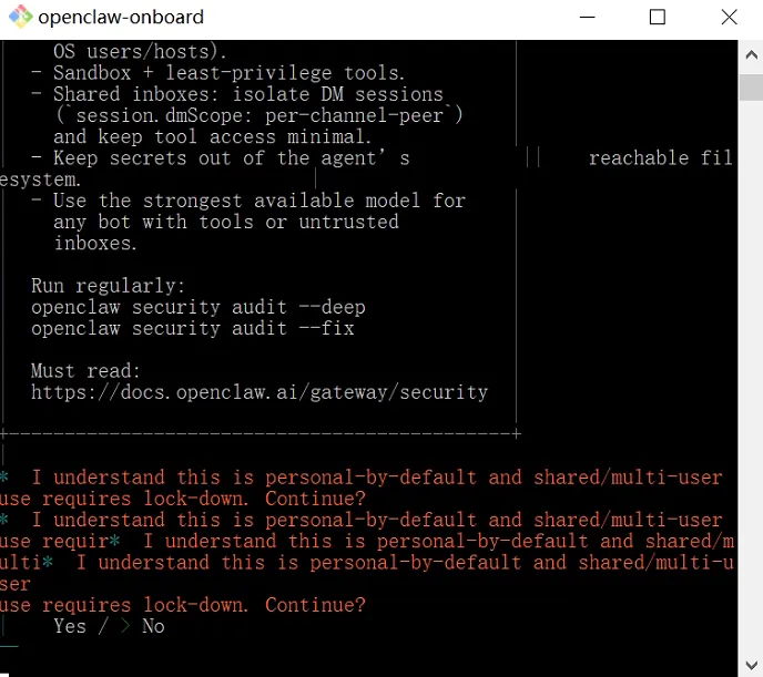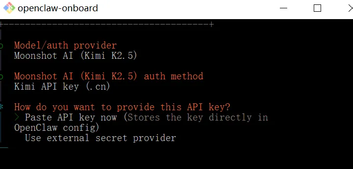 稍等一会,安装好后,输入:openclaw -v如果显示象下面那样的出现版本号,就表示安装好了:四、初始化Openclaw配置:在powershell中输入命令:openclaw onboard然后出现一段英文,大意是“默认仅供个人使用,多人共用需自行加固安全,是否继续?”,用键盘上的上下左右键,按左健选择Yes,回车即可。然后出现 Onboarding mode,选默认的 QuickStart然后出现Model/auth provider,要选大模型了,这一步是重点,这里以Kimi为例:按键盘向下键,选择Moonshot AI (Kimi K2.5) (Kimi K2.5 + Kimi Coding),回车。然后选选Kimi API key (.cn)(国内普通 Kimi 官方密钥,网速快、好用、适合日常)。然后要输入密钥。如果之前没有准备,那么这时要先到Kimi的开发平台去注册一个账号: