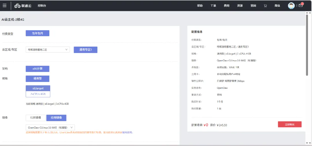 选好了服务商,购买云主机还是很方便的,以联通云为例,购买云服务器ECS,在应用镜像中选择OpenClaw镜像,就可以了。