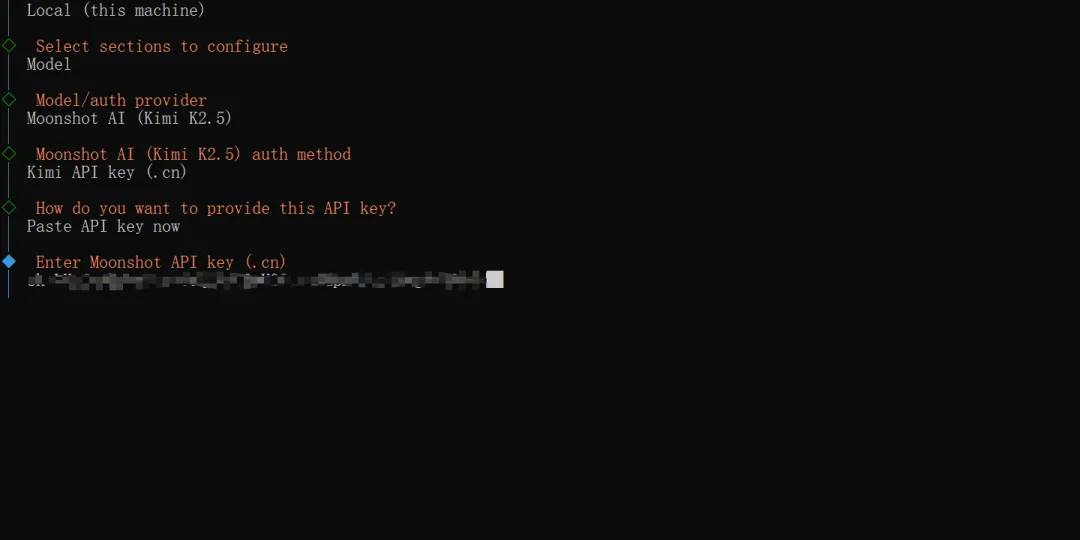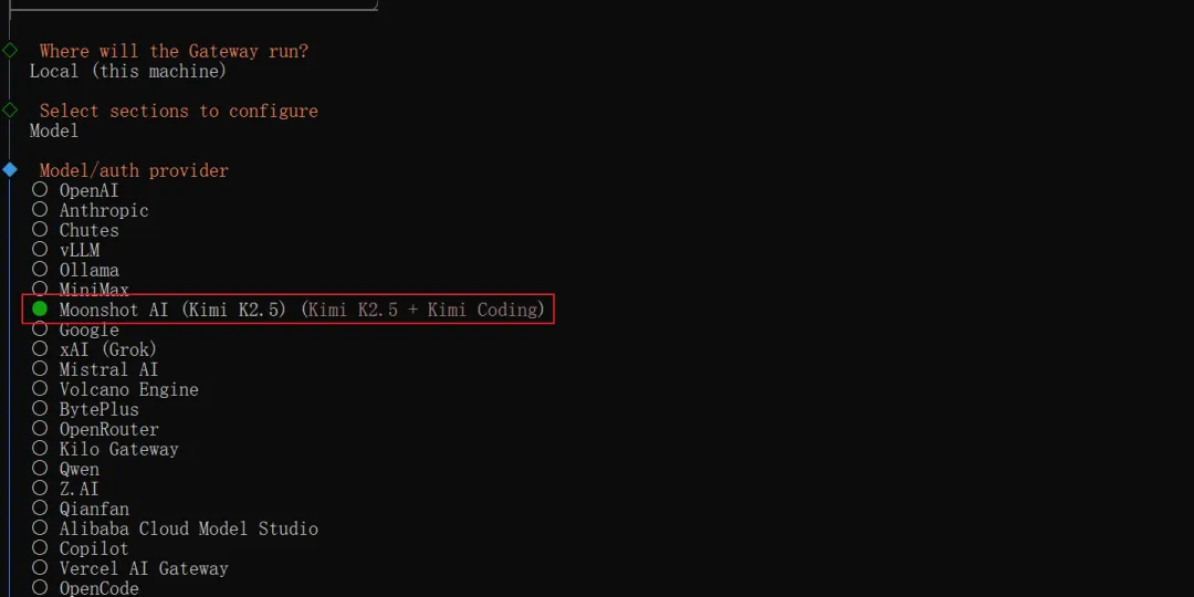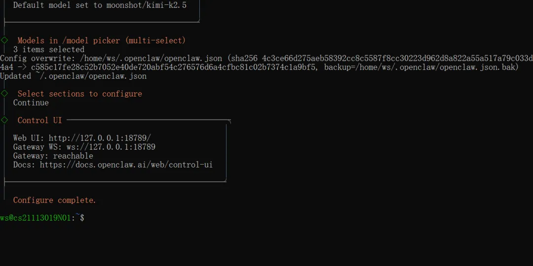 openclaw config set <路径> <值> 非交互式设置配置项,例如设置默认模型:openclaw config set models.default moonshot/kimi-k2.5 。