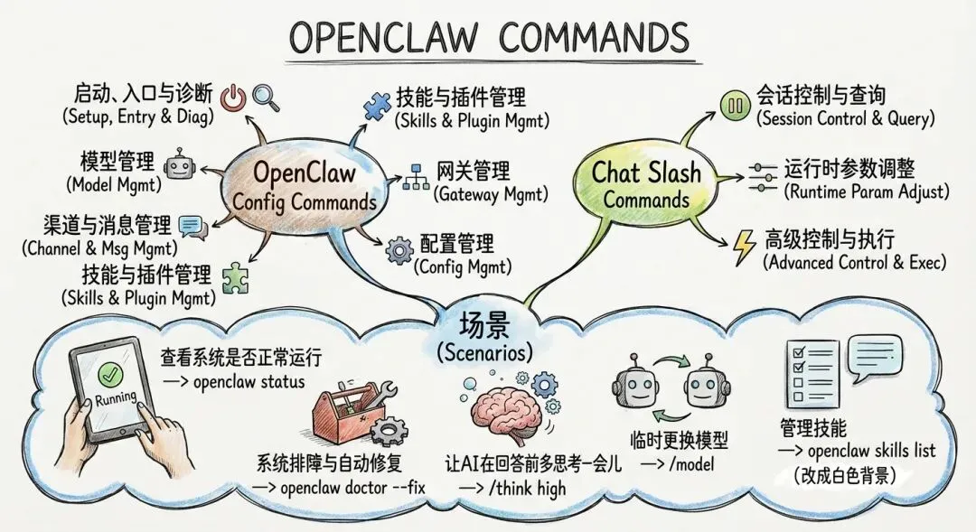 启动、入口与诊断openclaw onboard : 启动交互式配置向导,是首次安装后必须运行的命令,用于引导设置模型、API密钥、消息渠道等。
